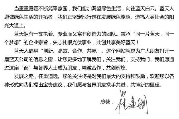 您現(xiàn)在的位置:江蘇藍(lán)天光伏科技有限公司 > 走進(jìn)藍(lán)天 > 總裁致辭