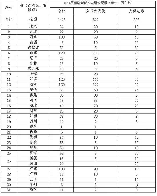 各地區(qū)2014年新增光伏發(fā)電建設(shè)規(guī)模表