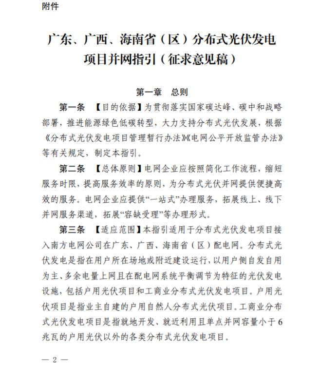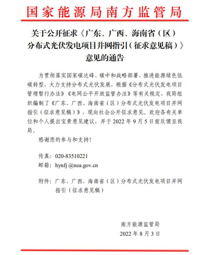 8月3日,國家能源局南方監(jiān)管局發(fā)布《廣東、廣西、海南�。▍^(qū))分布式光伏發(fā)電項(xiàng)目并網(wǎng)指引(征求意見稿)》,該指引適用于分布式光伏發(fā)電項(xiàng)目接入南方電網(wǎng)公司在廣東、廣西、海南�。▍^(qū))配電網(wǎng)。